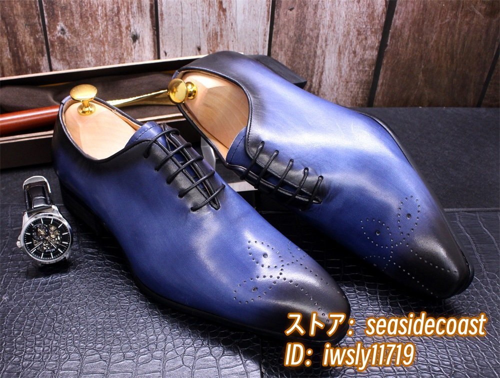 > 定価11万★超希少 ビジネスシューズ メンズ 職人手塗仕上げ 彫り 本革レザーシューズ 最高級 紳士靴 フォーマル 革靴 牛革 ブルー 25.5cm