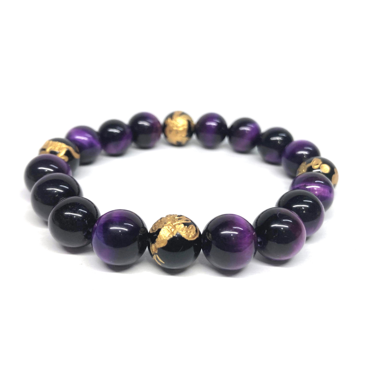 - 10mm 四神獣金彫オニキス×パープルタイガーアイ パワーストーン ブレスレット天然石 運気上昇 開運 金運 青龍 白虎 玄武 朱雀 ☆
