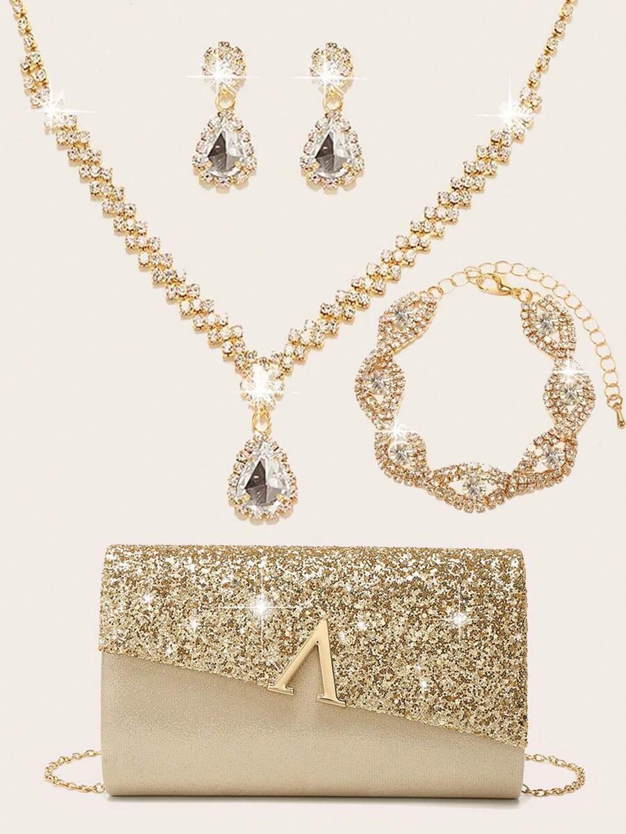 - バッグ レディース ドレスバッグ 4点セット ラインストーンアクセサリー ネックレス ピアス ブレスレットセット、結婚式クラッチバ