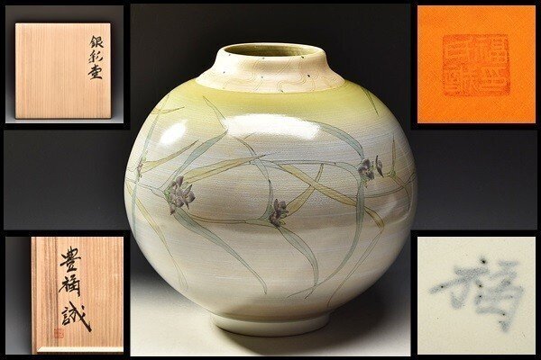 > U06702 40cm! 東京芸大 豊福誠 色絵 銀彩 壺 大壺 共箱 個展作 /桜