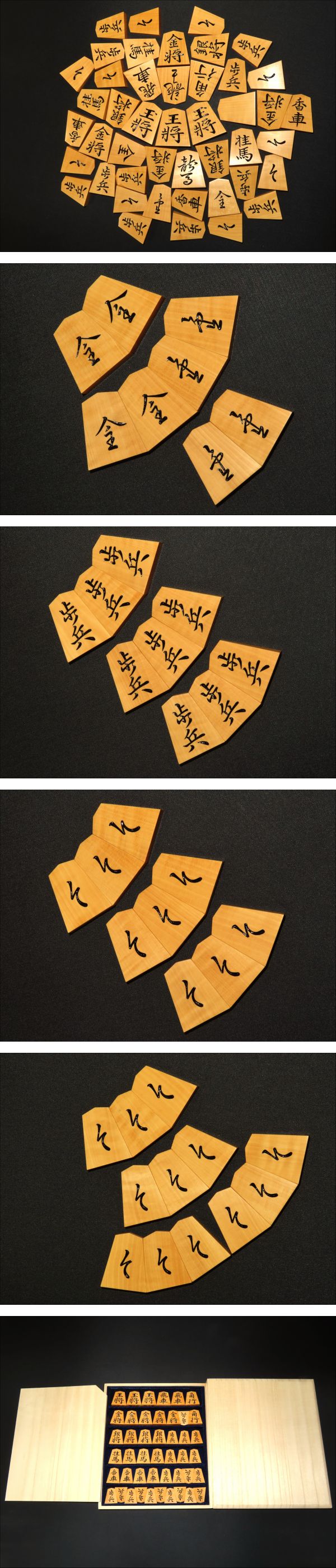 木地は御蔵島黄楊斑入上柾目。ご覧のとおり味のよい木地です。すべての駒の表裏をUPいたしましたので是非ご覧ください。