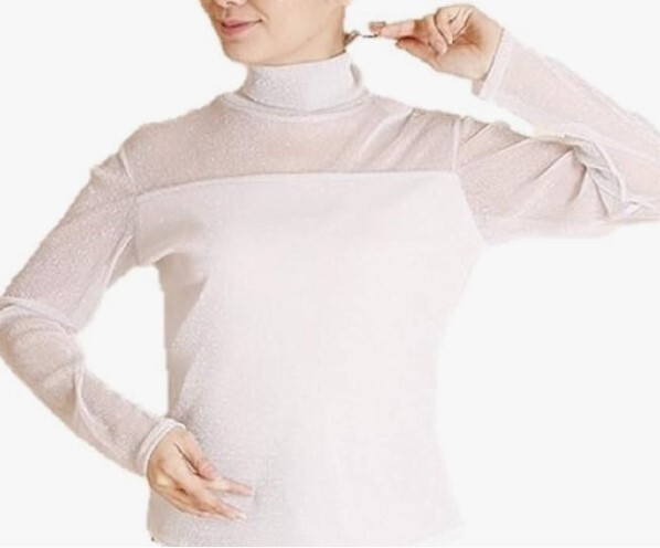 > レディース シースルー ハイネックプルオーバー トップスラメ混シルバーFサイズ 長袖 カットソー シースルー チュール ストレッチ 透け感