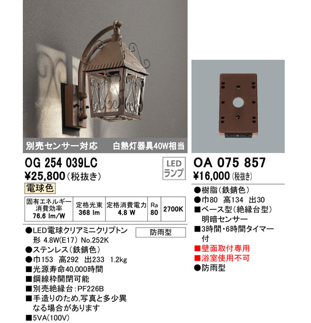 - 【未使用品】オーデリック LEDポーチライト・ベース型明暗センサーセット OG254039LC・OA075857 防雨型 ODELIC【長野発】
