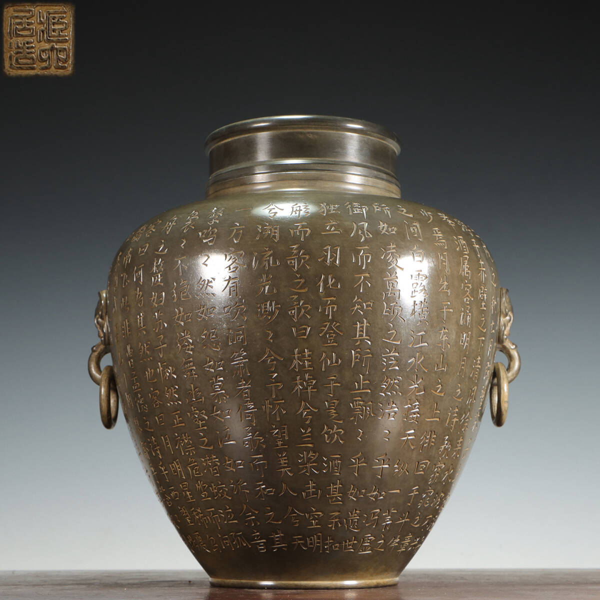- 古錫 茶葉罐 蔵六居造 「錫刻赤壁賦輔首耳茶心壺」 茶筒 茶入 茶壷 茶道具 錫肌 金工 茶器 時代物 重さ2479g LT-251048