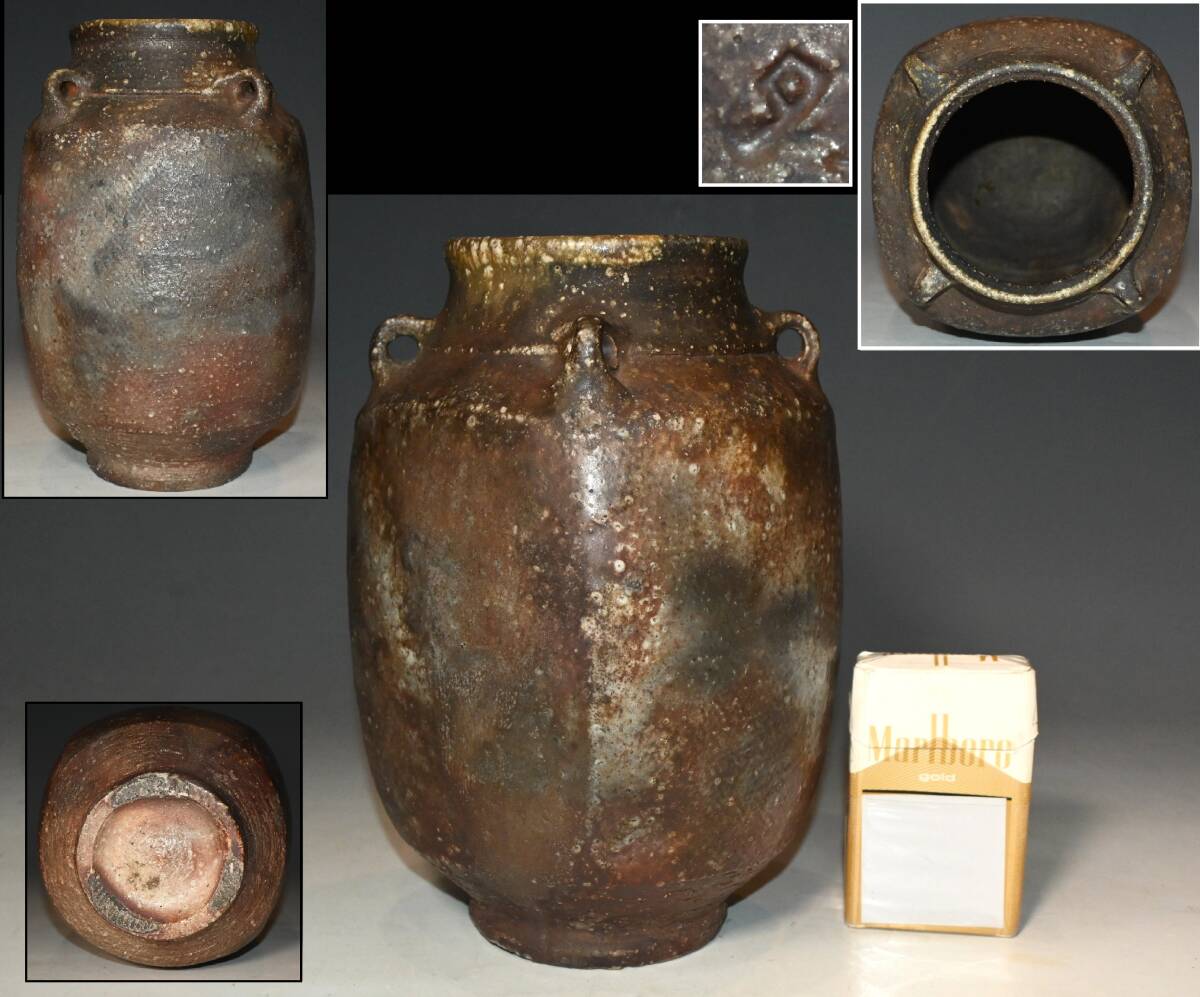 > 真贋保証■人間国宝 島岡達三 造■ 窯変 灰被象嵌縄文四耳壷 箱無 高約22.5cm 面取花瓶 花器 飾壷 益子焼 民芸 民藝 茶道具 浜田庄司に師事