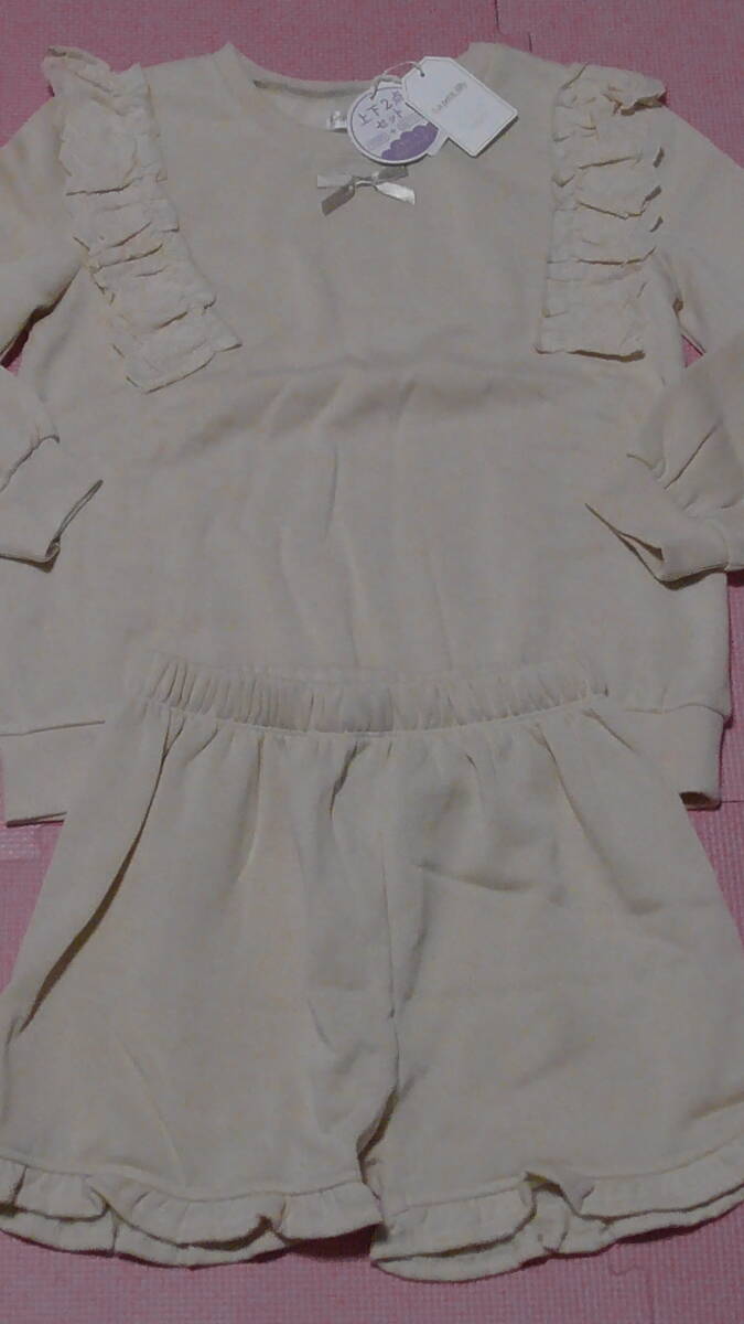 > 新品 130 上下2点セット 肩フリルレース トレーナー ショートパンツ ベージュ トップス ボトムス まとめ売り 女の子 裏起毛 120〜 送料無料