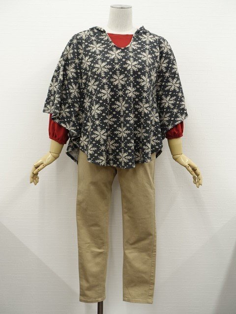 > 美品 INDIVI等 ポンチョ+カットソー+スキニー コーディネート3点セット M相当 グレー地 ノルディック柄/赤/ベージュ カジュアル系 20代