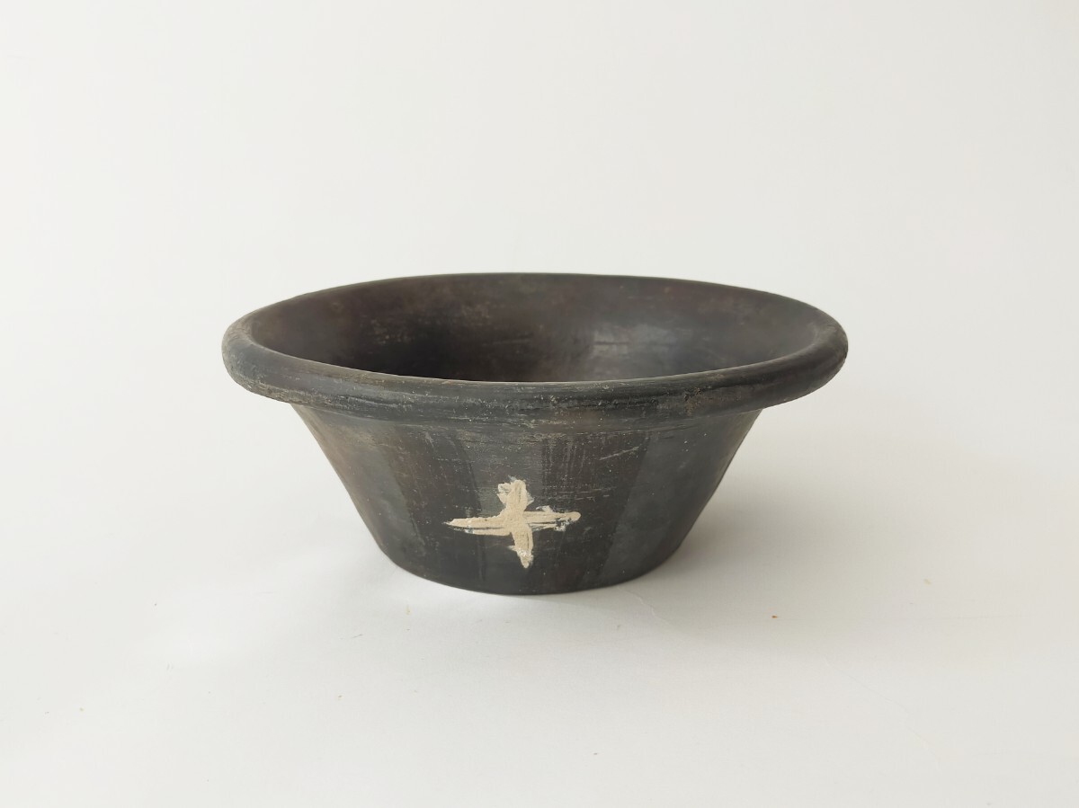 > 詳細不明、十字の紋様入り 古い陶器の鉢 古陶 民藝 東欧?プリミティブ? アンティーク 工芸品 民藝 ポット テラコッタ 世紀 時代 骨董古美術