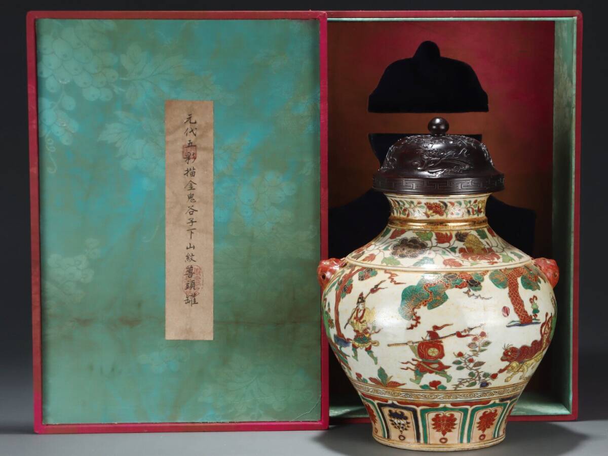 - ▽鴻▽元朝時代 陶磁器 五彩描金鬼谷子下山紋獣頭罐 紫檀木蓋 箱付き 染付 時代物 中国古美術 骨董品