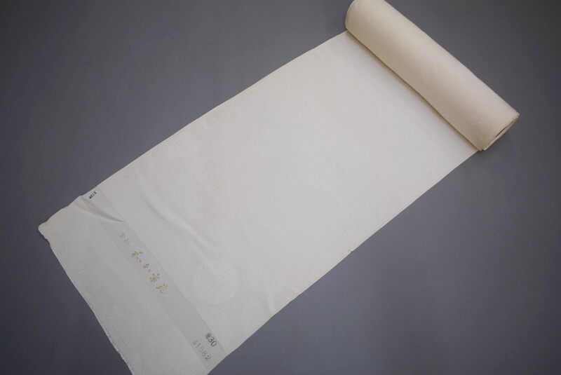 - B22-8【凛々】新古品 正絹 紋意匠ちりめん 白生地 着尺反物 菊 雲 未仕立て品