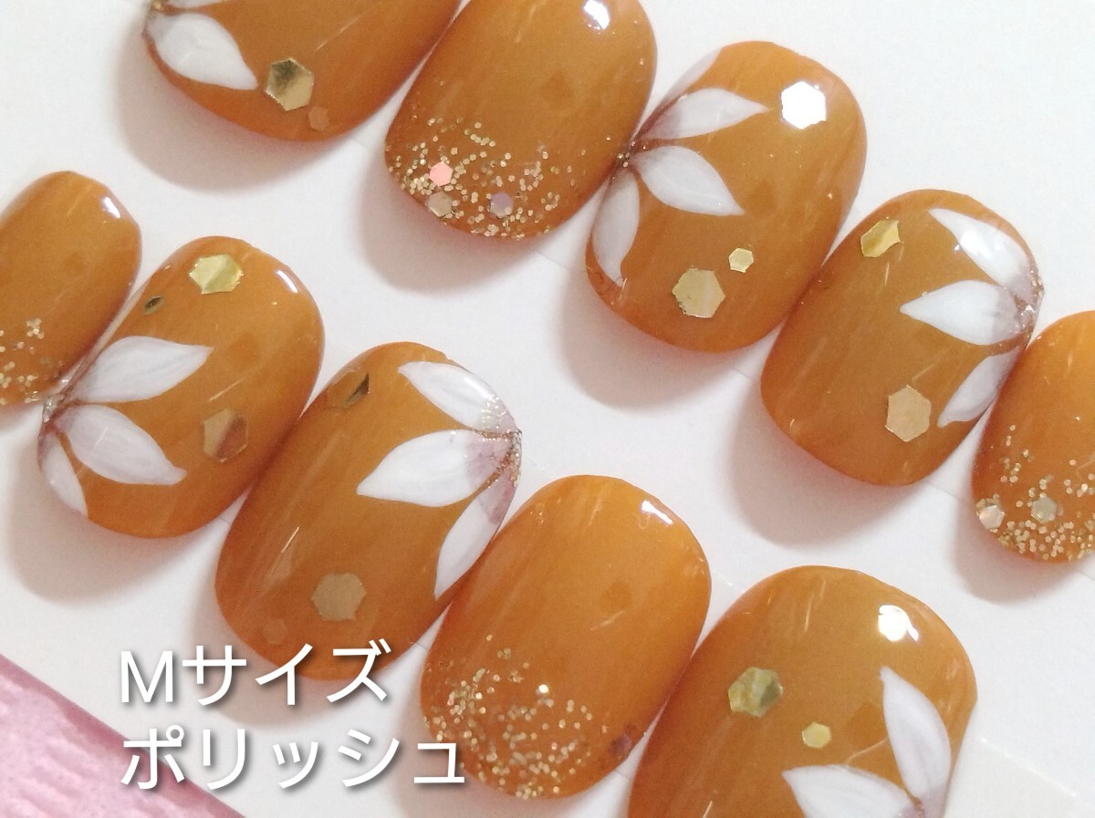 - Mサイズベリーショート・マスタードイエローポリッシュフラワーペイントゴールドホログラムネイル和風成人式
