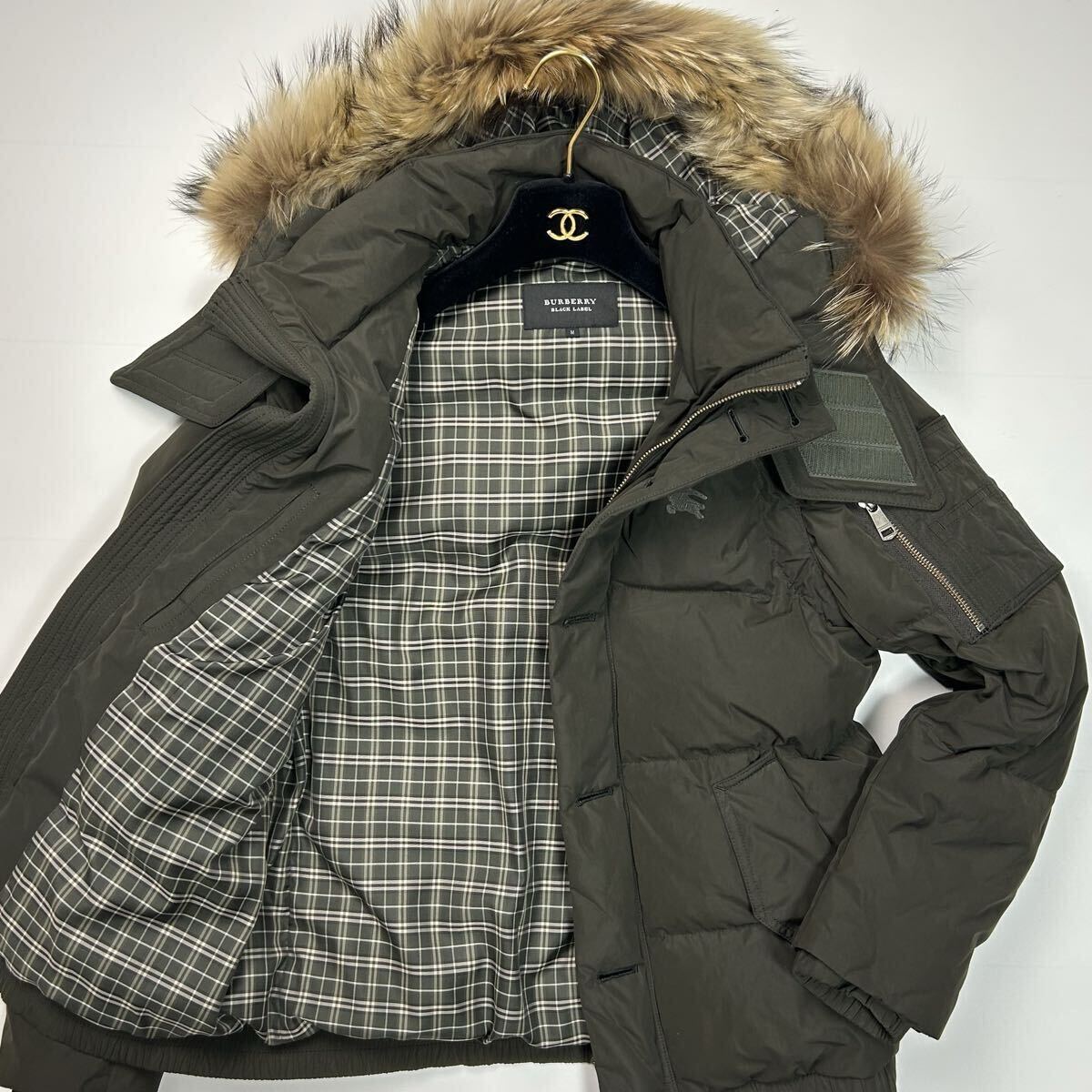 > 美品★ BURBERRY BLACK LABEL バーバリーブラックレーベル ダウンジャケット 6way ラクーンファー フード カーキ ホースロゴ ノバチェック