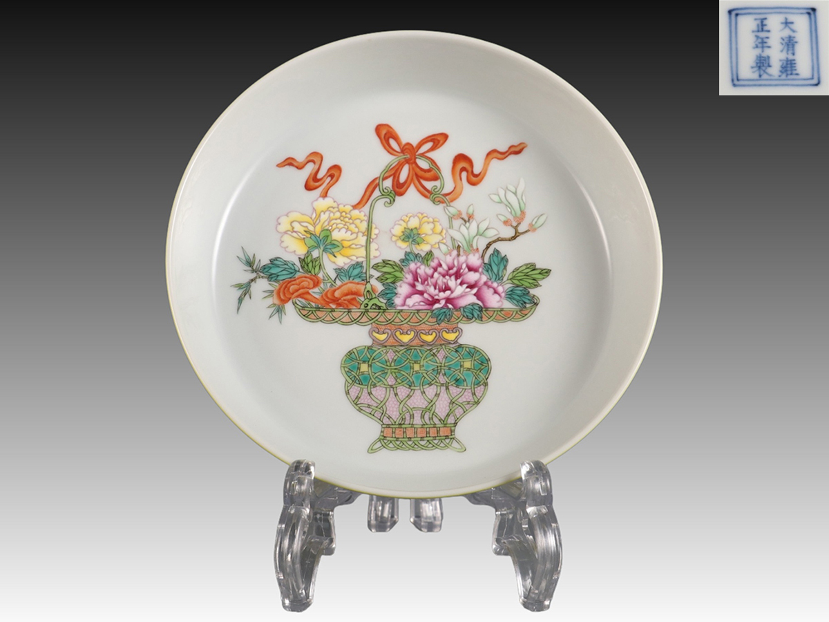 - ▽鴻▽清時代 陶磁器 黄釉内琺瑯彩提籃花紋臥足盤 清雍正年製款 共箱 時代物 中国古美術 骨董品