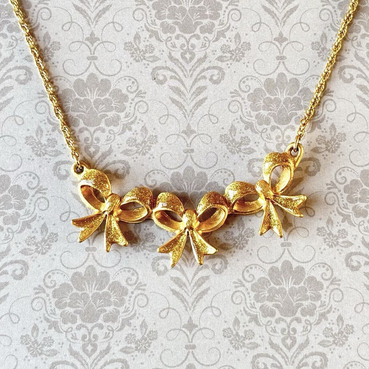 - トリプル リボン ネックレス 金色 ゴールドカラー ラメ キラキラ かわいい 可愛い アクセサリー
