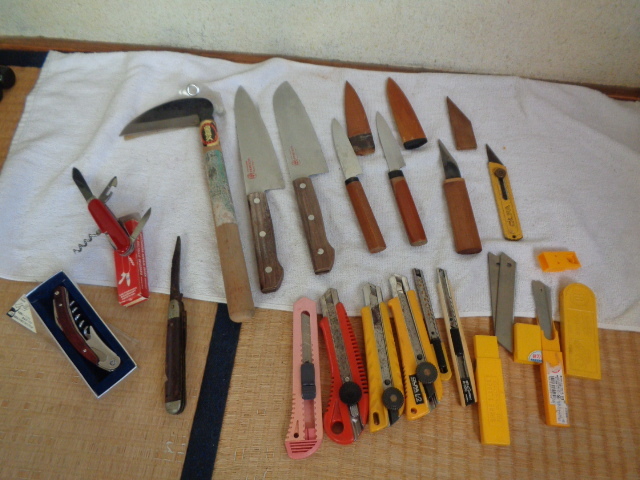 - 刃物 多種 色々 まとめて16点+カッター刃2ケース/鎌・切り出しナイフ・包丁・果物ナイフ・カッターナイフ・カッター刃・etc/