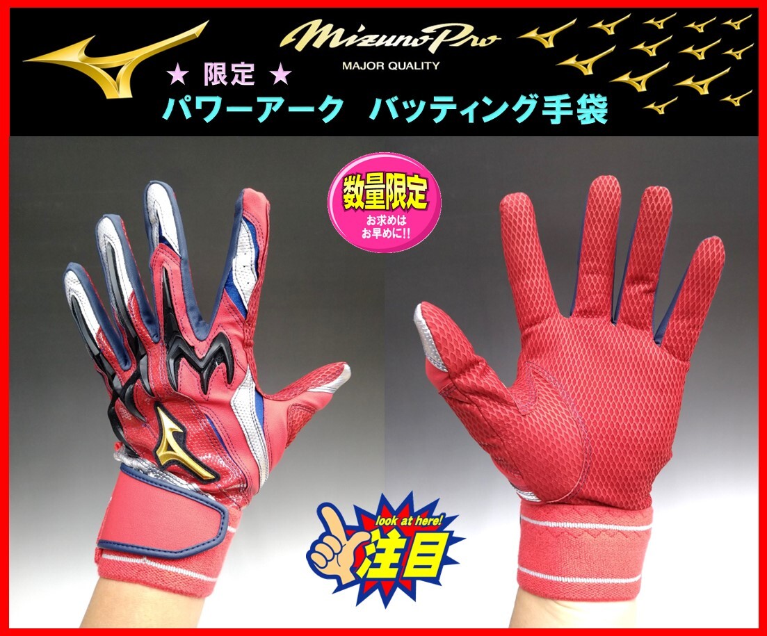> ◆送料&刺繍無料◆ 25cm ミズノプロ バッティング 手袋 1EJEA52962 赤×銀×紺 パワーアーク グラブ 型押し グローブ 天然皮革 限定