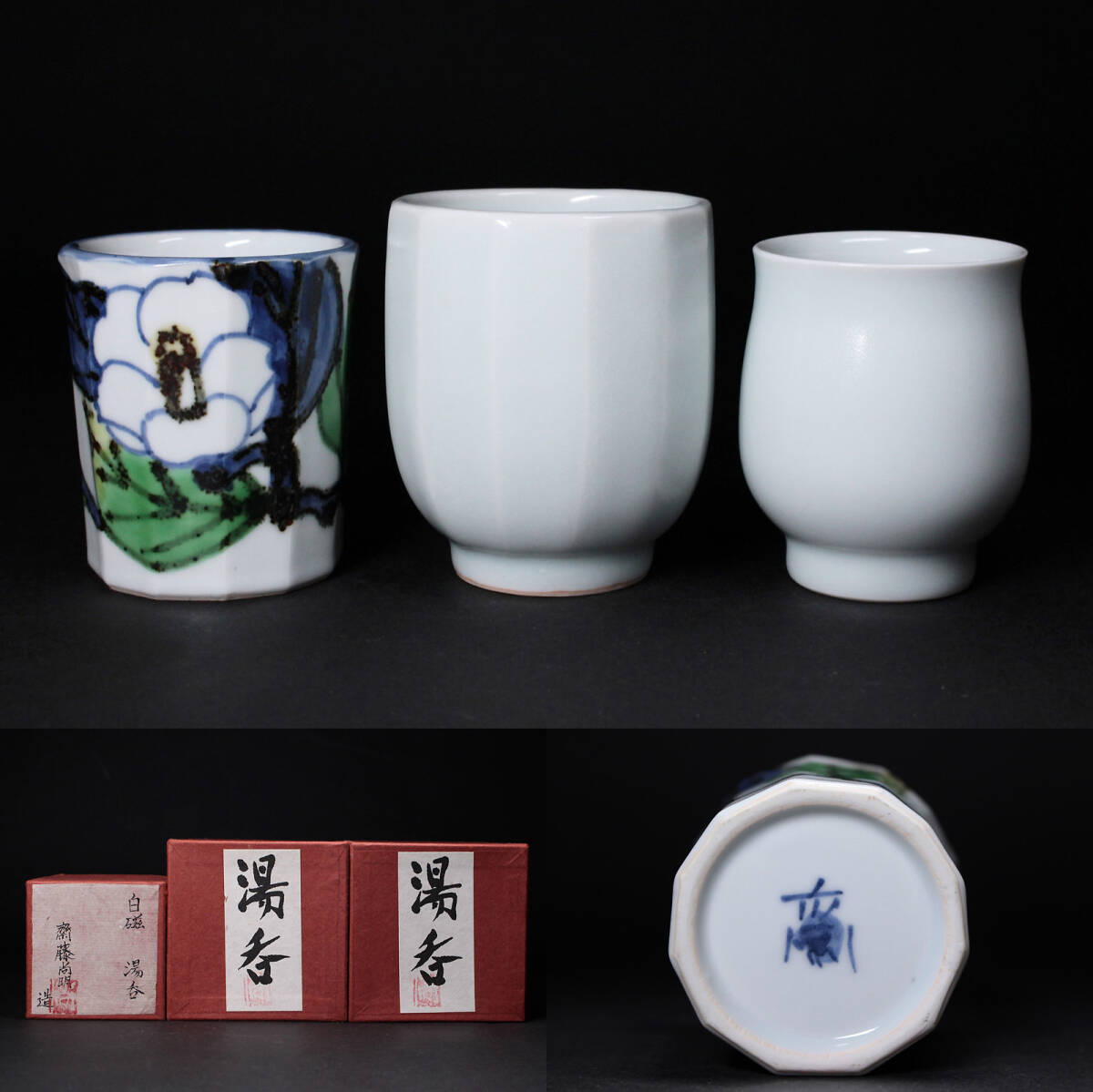 - 斎藤尚明 湯呑 三客組 白磁 面取り 色絵 共紙箱 検索: 懐石道具 茶懐石 料理皿 和食器 向付 会席道具 会席料理