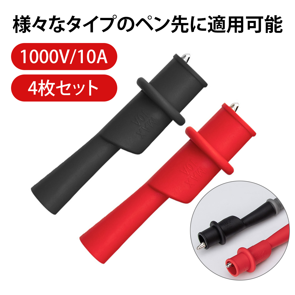 - 【4本入り】ワニ口クリップ テスター棒用アリゲータークリップ|最大1000V対応・10A対応;J5488-2ps;