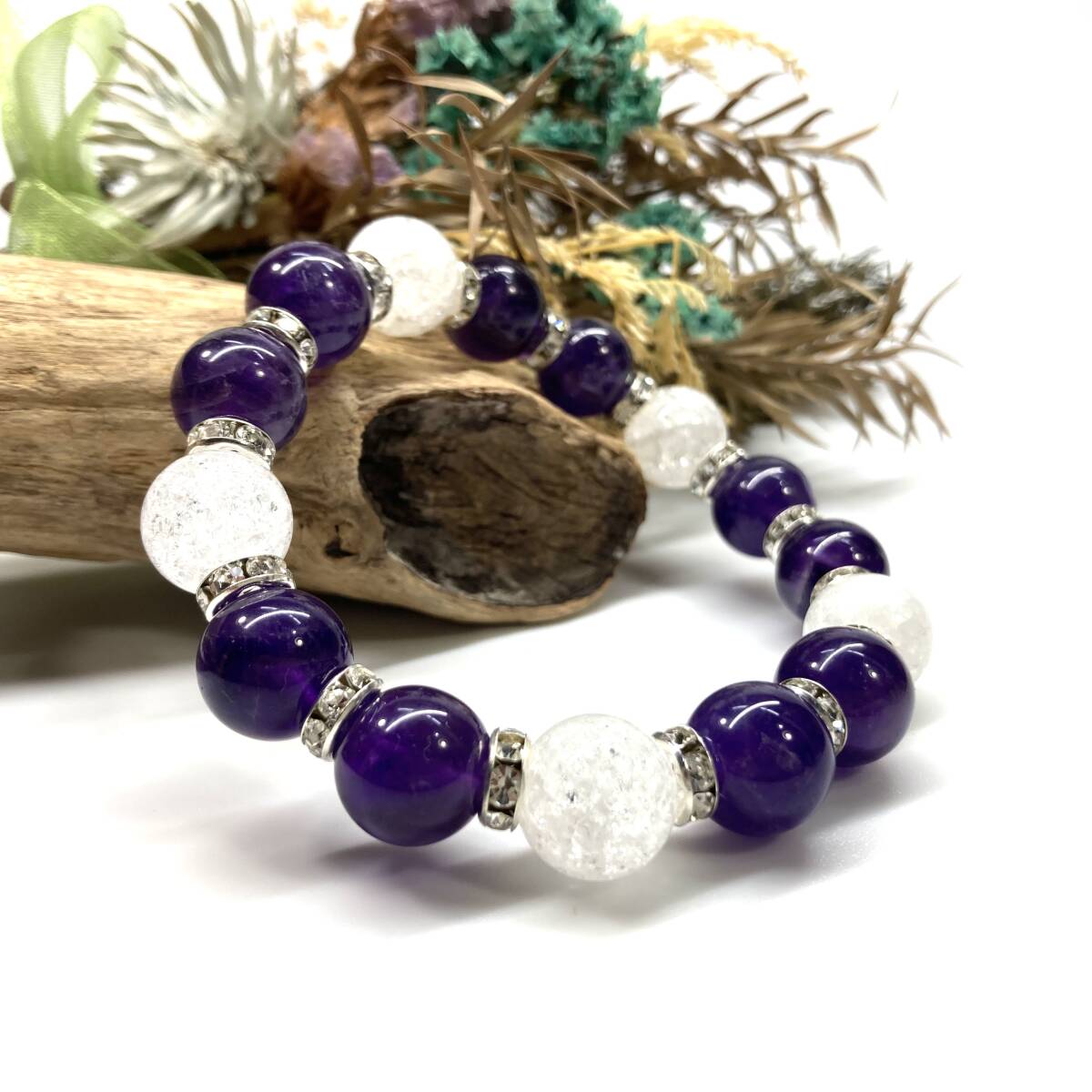 - クラック水晶&アメジスト パワーストーン ブレスレット 天然石ブレス (シルバー) 12mm 金運 仕事運 メンズ・レディース 男性 女性