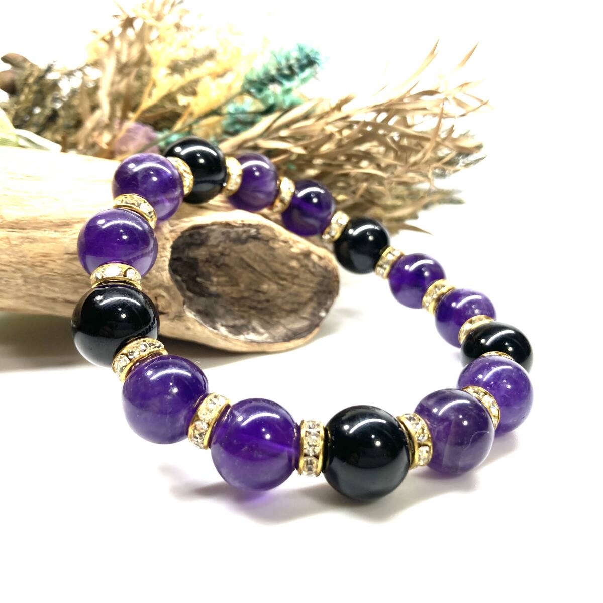 > モリオン&アメジスト パワーストーン ブレスレット 天然石ブレス (ゴールド) 12mm 金運 仕事運 メンズ・レディース 男性 女性