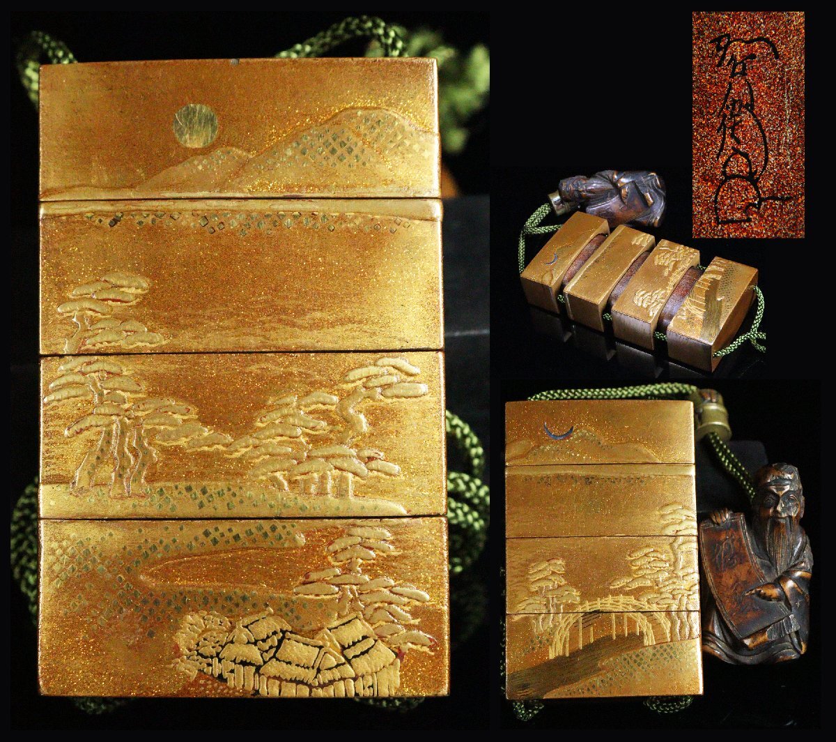 > 【ASAHI】時代 珍品 四方面取り印籠 在銘 総金梨地 山水楼閣図高蒔絵 面取四段印籠 木製老人根付 コレクター放出品[71093qyp]