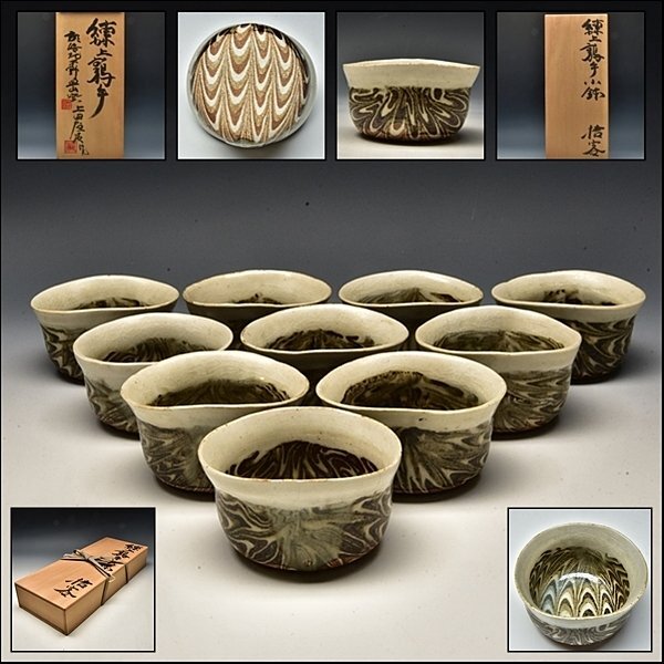- SP6386 上田恒次 練上鶉手 木野皿山窯 小鉢 向付 十客 共箱 民藝 師 河井寛次郎
