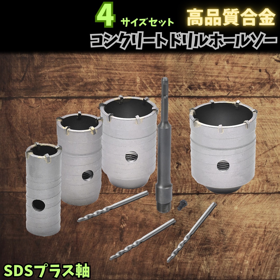 > コンクリート ホールソー ドリル ビット 超硬 SDS プラス コアビット コアドリル センター 穴あけ 穴開け ホルソー シャフト 4本 セット