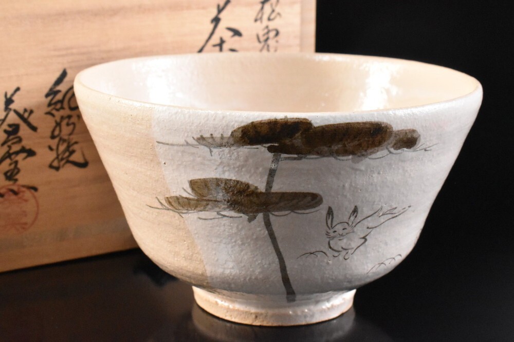 - 【雲】某収集家買取品 紀州焼 葵窯 白釉兎絵付抹茶碗 在銘 共箱 古美術品(茶道具) F8295