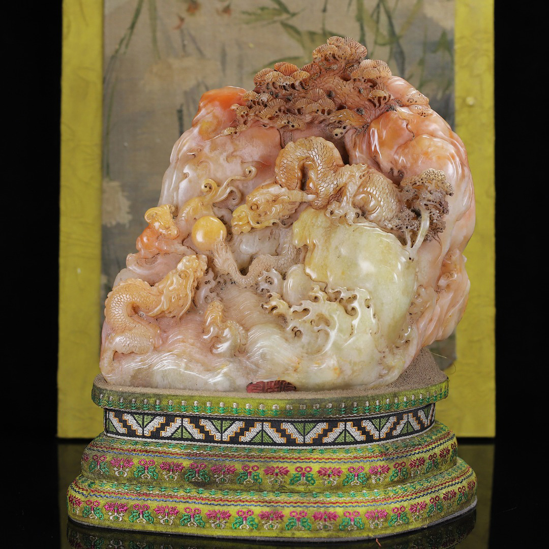 - ▽鴻▽清朝時代 寿山石 桃花凍石彫 双龍護主置物 林謙培作 箱付 時代物 中国古美術 骨董品