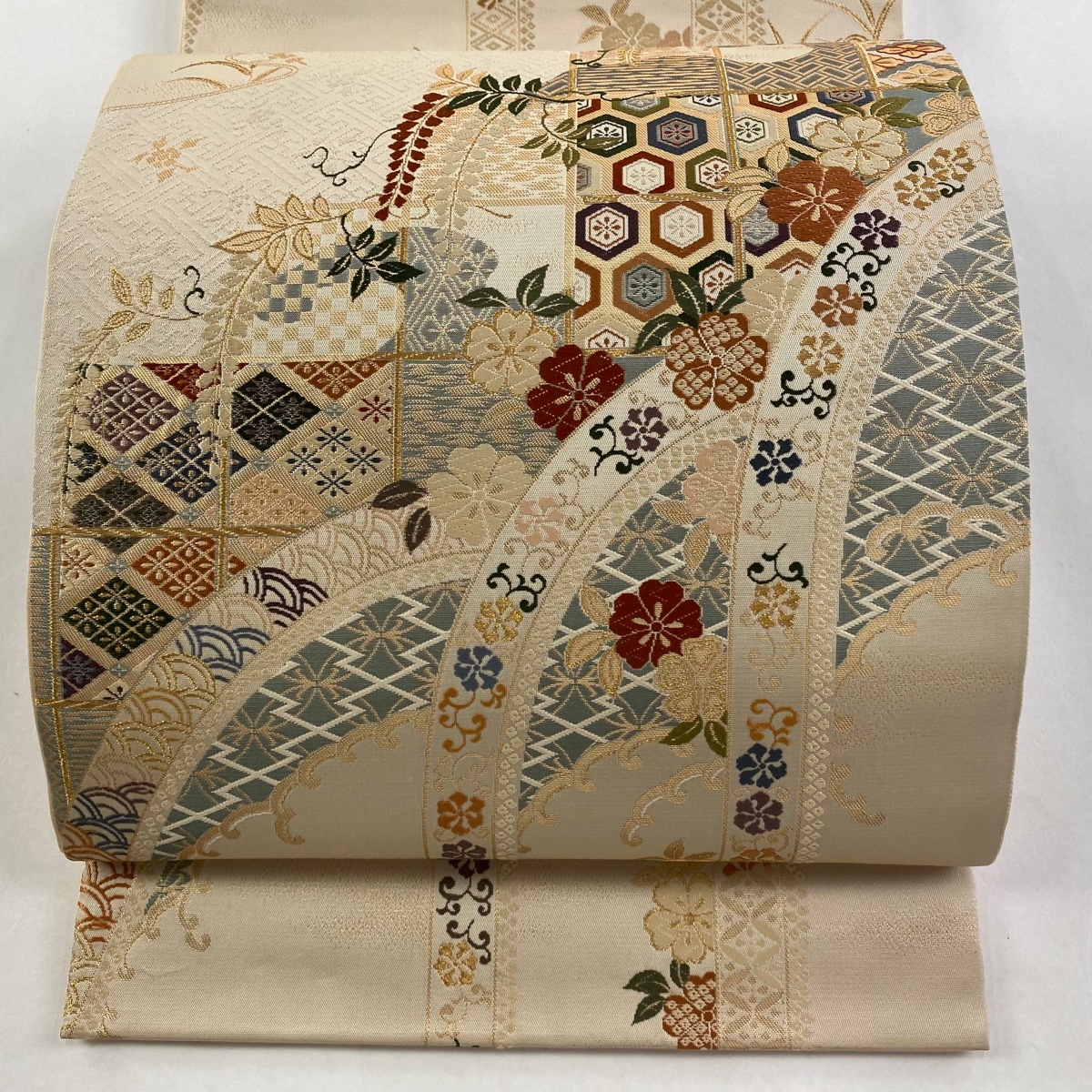 - 【美品】 袋帯 秀品 桜 有職文様 箔 金糸 ベージュ 六通 正絹 【中古】