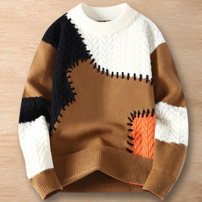 > Y231-L カーキ 新品DCKMANY ウール混 配色切り替えニット セーター ケーブル編み 暖かい 長袖 防寒 冬 メンズ プルオーバー トップス