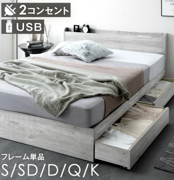 > ベッド 収納付き USB 2コンセント 宮付き 容量約77L シングル セミダブル ダブル クイーン キング すのこベッド ベッドフレーム