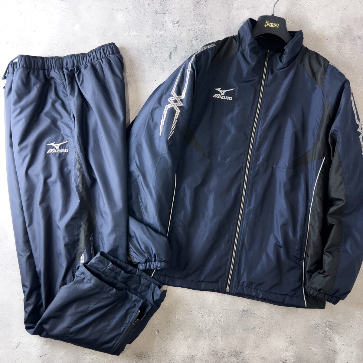 - MIZUNO ミズノ ブレスサーモ搭載 ウインドブレーカー 上下 セットアップ ジャケット & パンツ メンズ XL ネイビー スポーツ 防寒 ジャージ