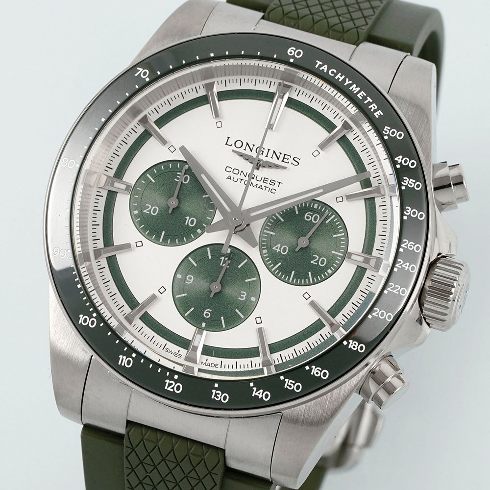 - LONGINES ロンジン Conquest Chronograph 腕時計 メンズ ウォッチ 自動巻き ラバーベルト 紳士 グリーン文字盤 L3.835.4.02.9