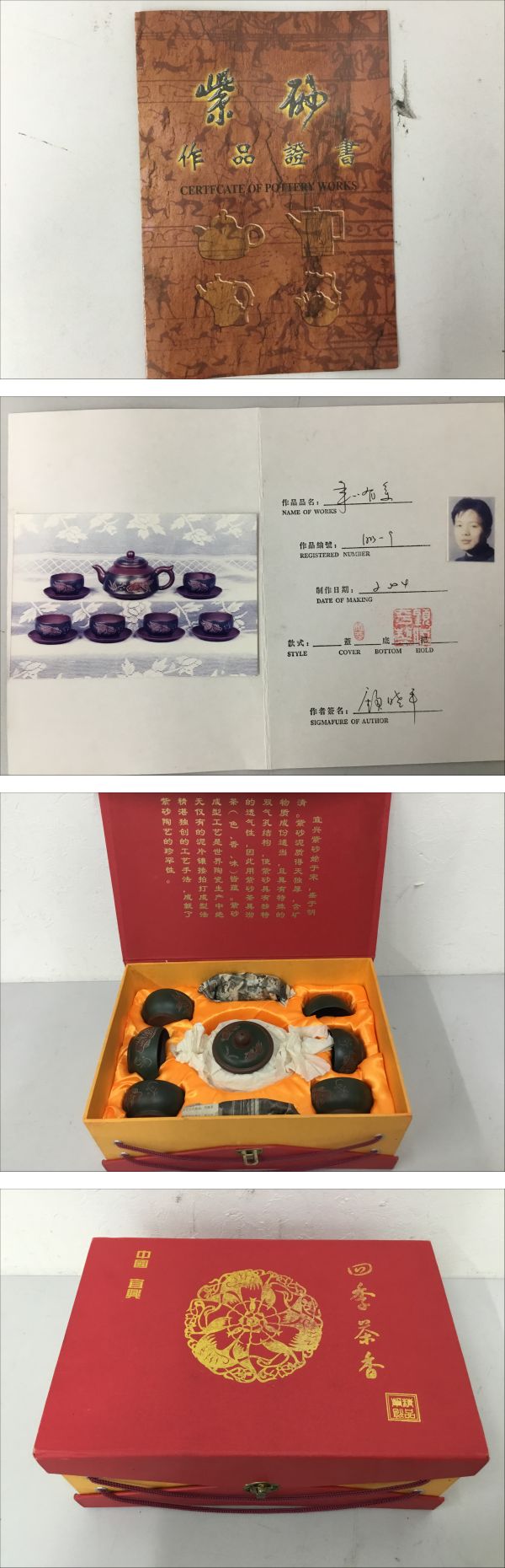- ●代EB521-80 中国宜興紫砂 四季茶香 茶器セット 湯呑み 急須 工芸陶器 名人 作品澄書付 金魚の絵 元箱付き /u