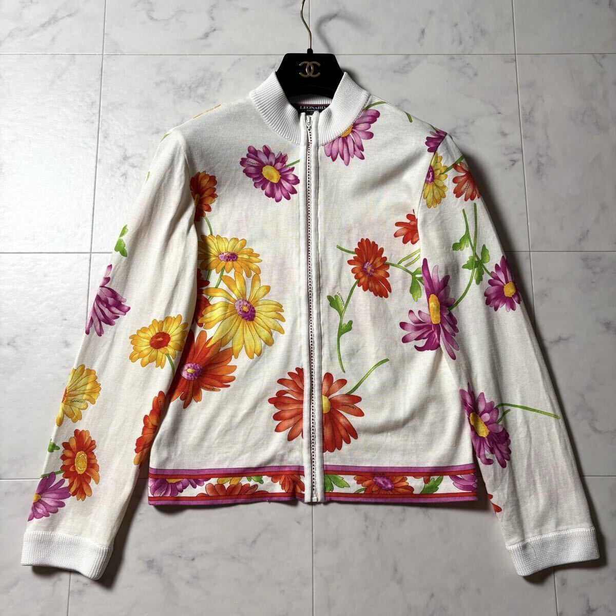 > LEONARD レオナール 花柄 トリム ラインストーン ジップアップ ジャケット ブルゾン カーディガン Lサイズ ホワイト 白 レディース