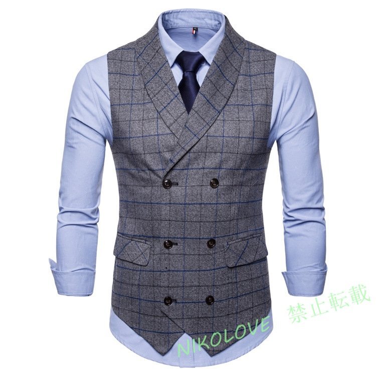 - ☆新品メンズビジネスベスト ジレベスト カジュアル チェック柄 紳士 ダブル 通勤 スーツベスト おしゃれ グレー M~4XL