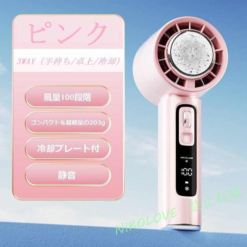 - 冷却プレート付 ハンディ ファン 瞬間冷感 手持ち扇風機携帯扇風機 100段風量 小型超軽量静音 ポータブル扇風機 涼しい 熱中症対策ピンク