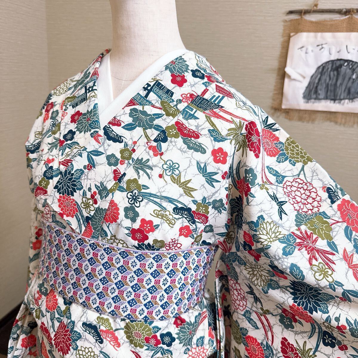- き577 【単衣きもの】白地に牡丹と家屋文様*レトロモダンな綿着物*涼やか・街着やお稽古にも◎ リメイク素材にも