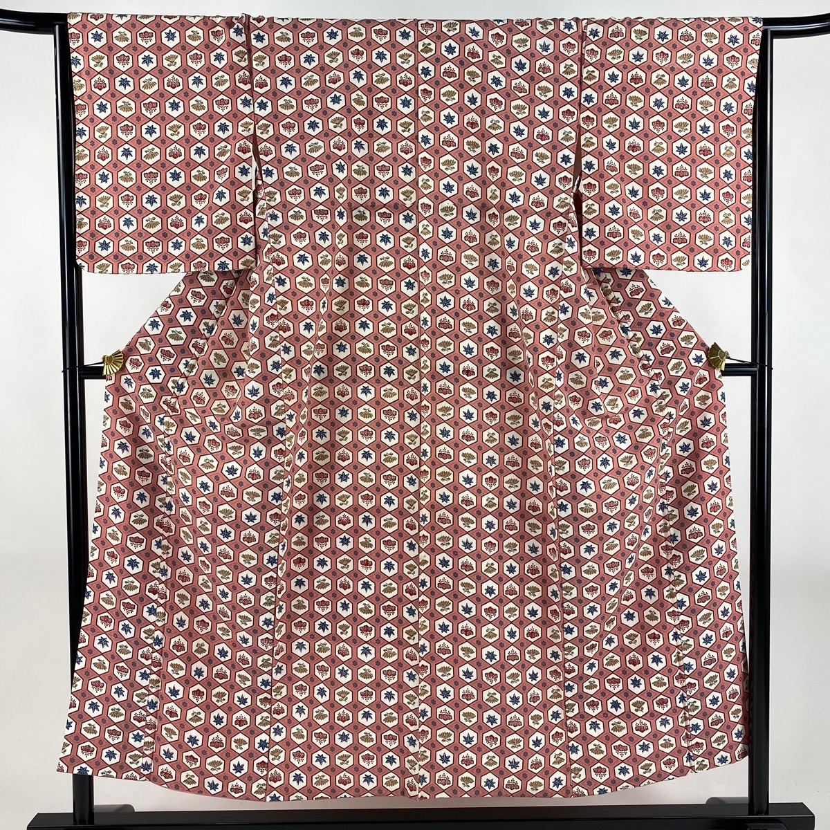 > 小紋 身丈152.5cm 裄丈64.5cm M 袷 亀甲 桐 縮緬 ピンク 化繊 優品 【中古】