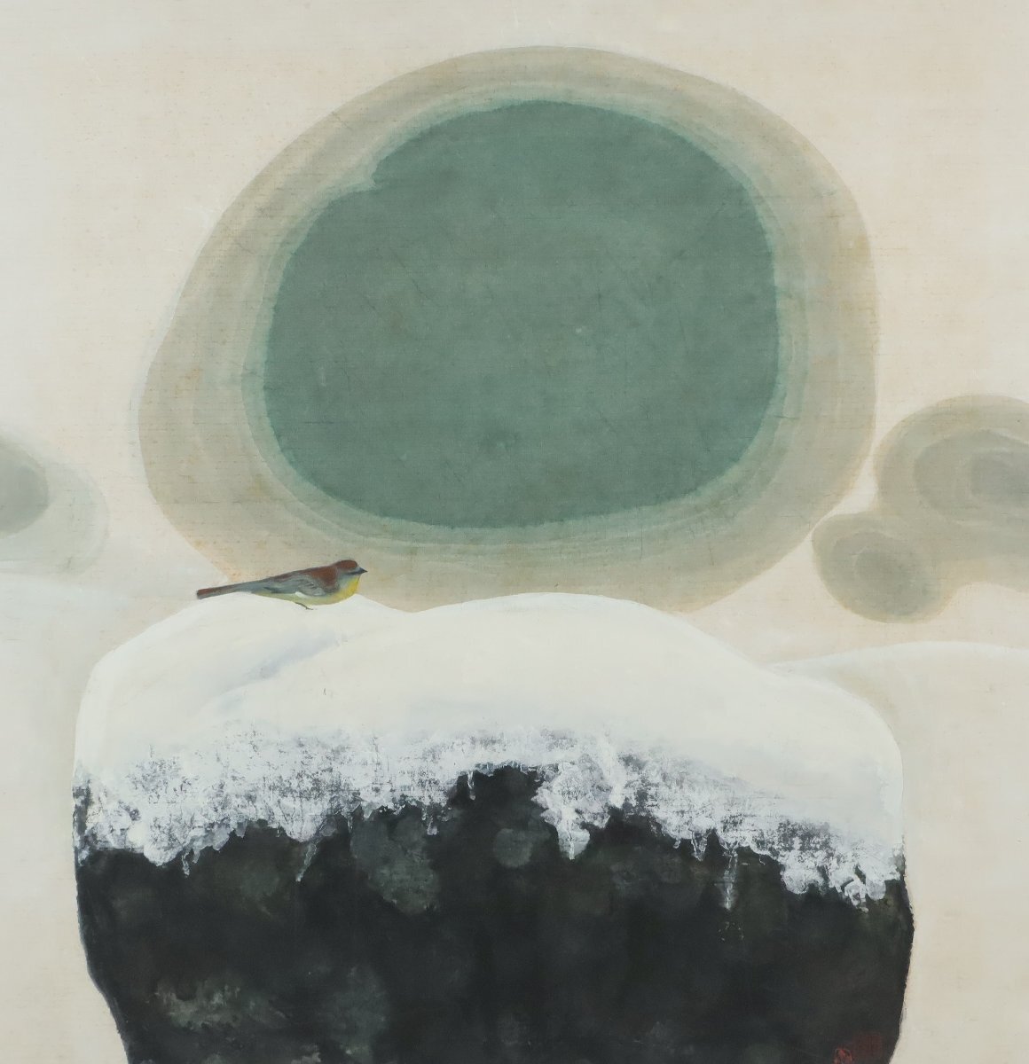 ・日本画「雪に鳥」陸齋銘 紙本 大型 額装品 260 /岩彩画 大作 作者不明 在銘