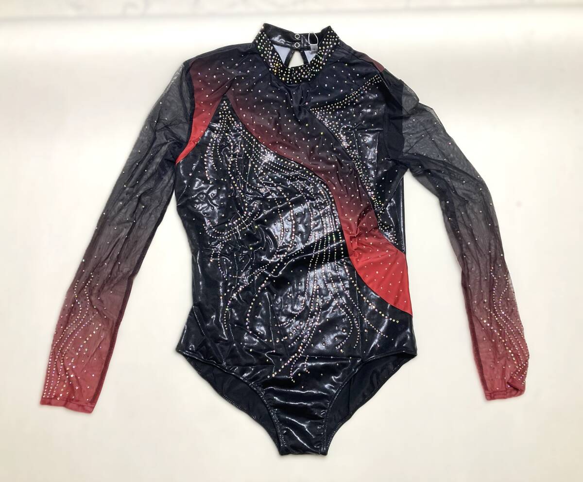- 特大2XLサイズ 黒赤/IEFIEL社製 長袖フィギュアスケートレオタードクリスタルラインストーンボディスーツバレエ体操ダンス ウエア