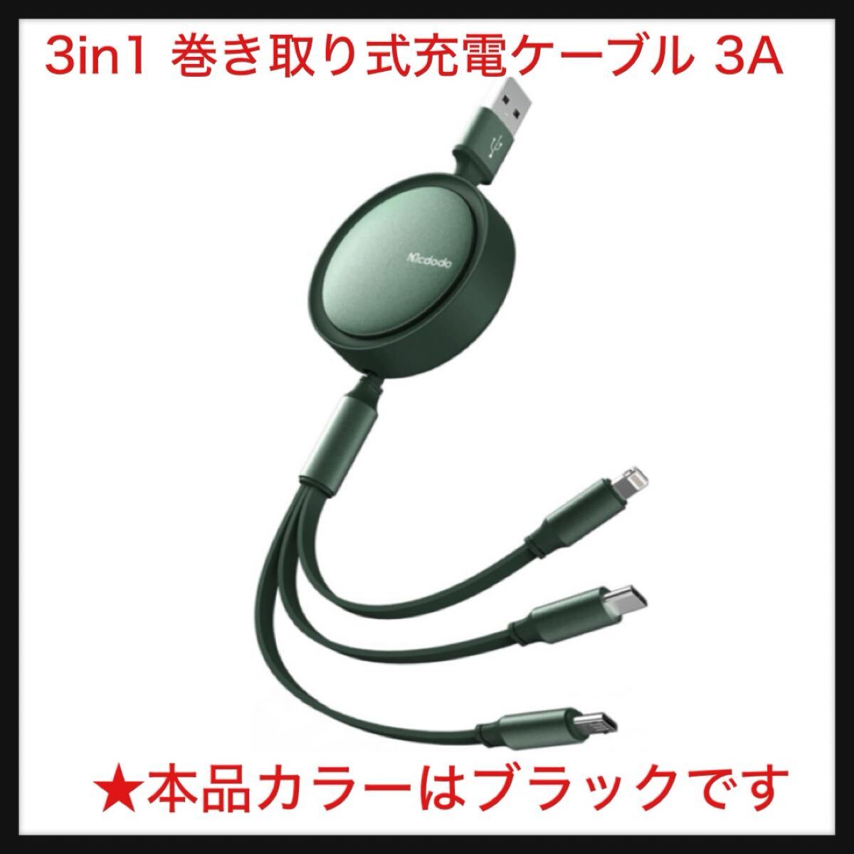 > 【開封のみ】Mcdodo ★3in1 巻き取り式充電ケーブル 3A急速充電 iPhone 16/15/14 Xperia/Galaxy/Pixel/Androidなど対応 ブラック