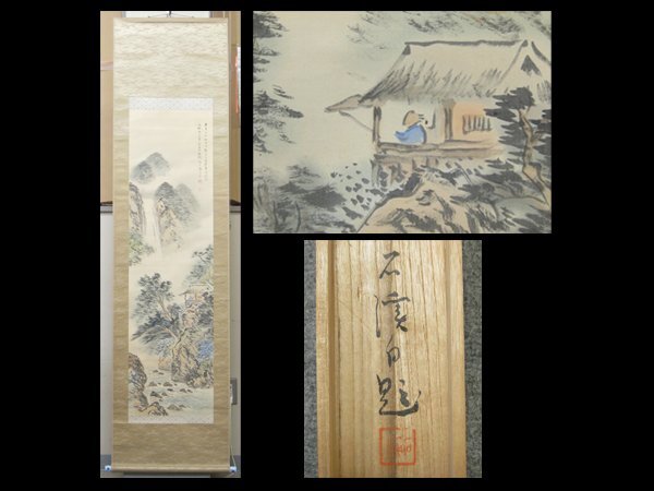 - 【心庵】掛軸 清水石渓 絹本山水「高士観瀑」/肉筆 共箱 真作 B352