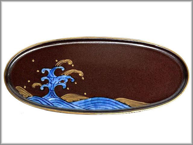 - 和食器●長皿●錦右衛門窯●楕円●茶の地●波の絵柄