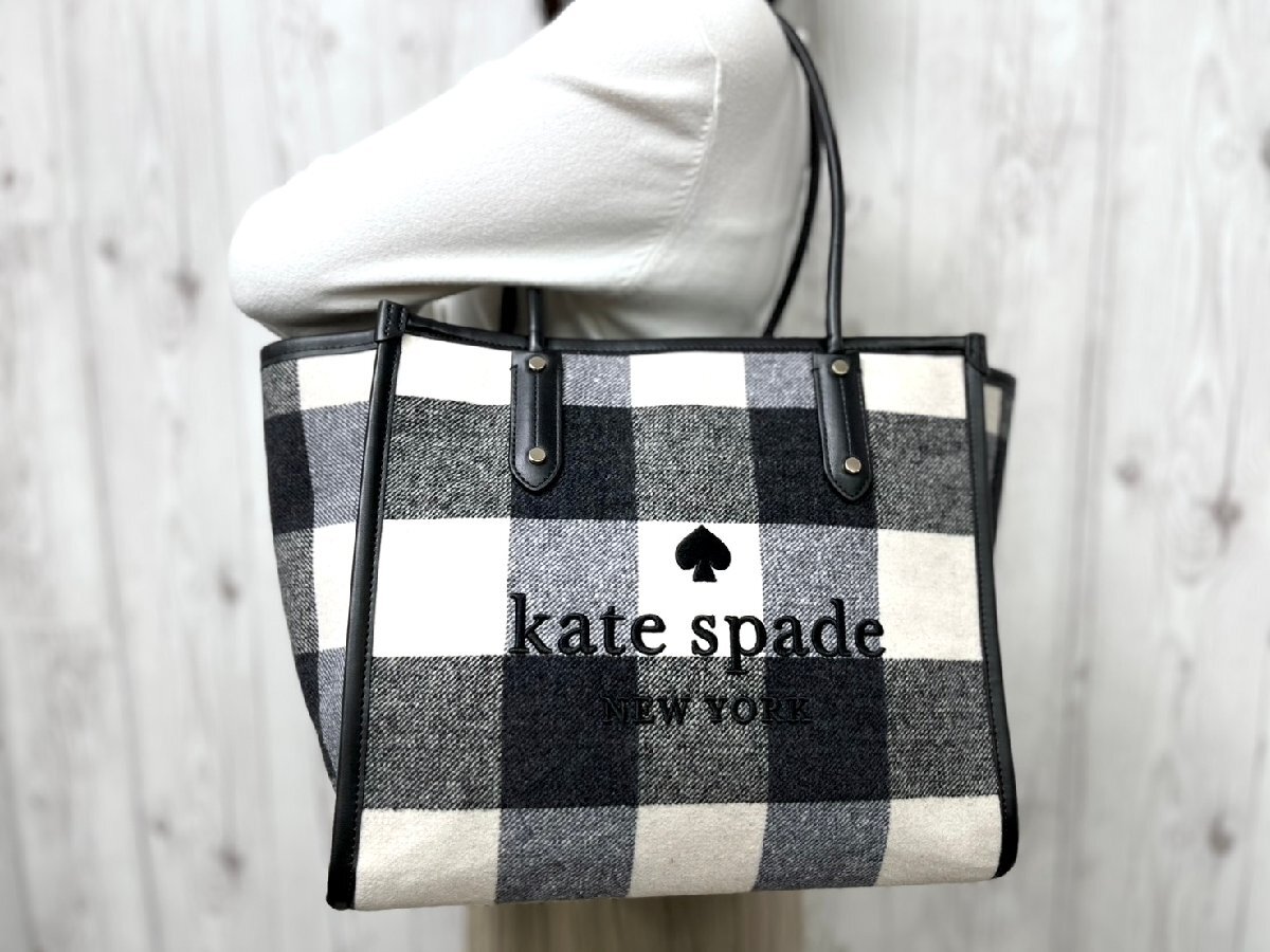 - 極美品 新品同様 kate spade NEW YORK ケイトスペード トートバッグ ショルダーバッグ バッグ ウール×レザー 黒系チェック柄 A4可 90973