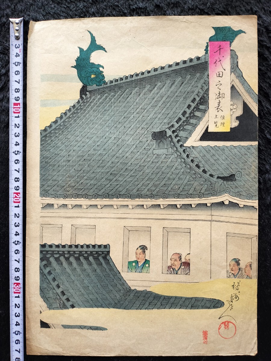 - 金鯱!明治期/真作 楊洲周延「千代田之御表 狼煙上覧」右 本物浮世絵木版画 名所絵 錦絵 大判 保存良い