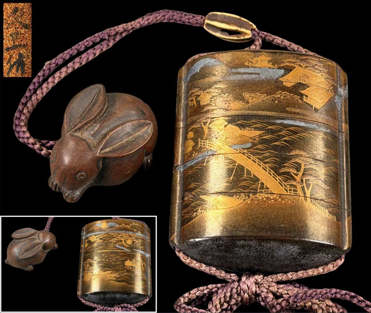 > 【偲】金蒔絵 四段 印籠 内梨地 うさぎ彫 根付 緒締玉 提げ物 古美術品 細密細工 希有 7.5cm/5cm 飾り物 時代物工芸品 重53g r-1024