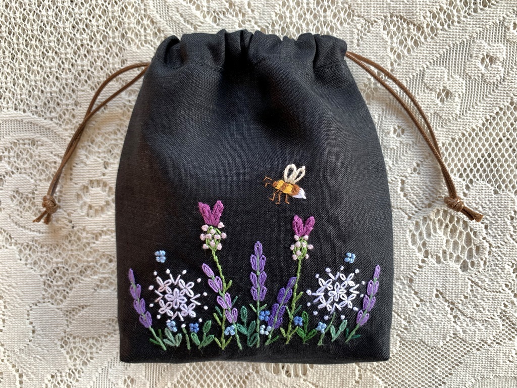 > ハンドメイド 手刺繍「蜜蜂とラベンダーガーデンの巾着ポーチ」コスメ用品 アクセサリー 小物 黒色 2