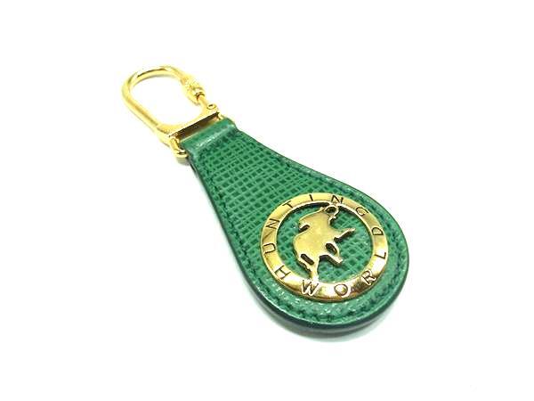 > ■美品■ HUNTING WORLD ハンティングワールド ロゴ レザー キーホルダー キーリング バッグチャーム グリーン系×ゴールド系 DJ5819